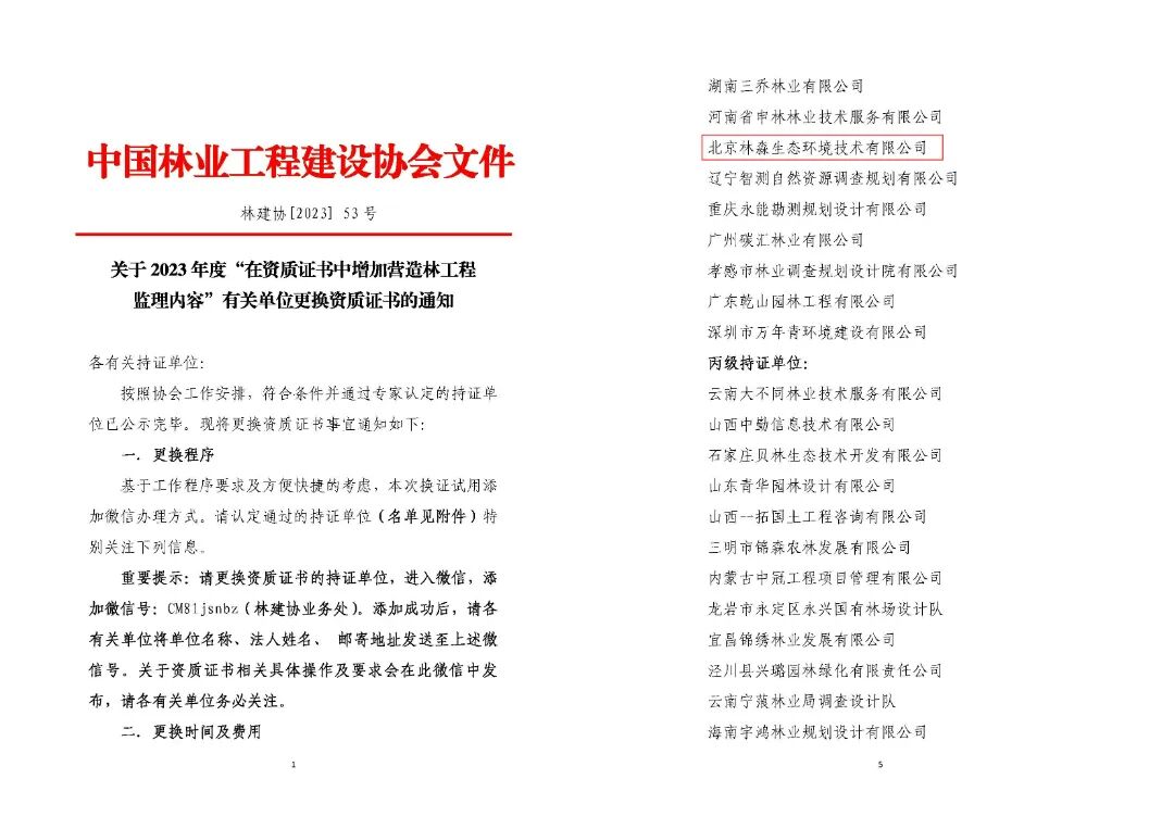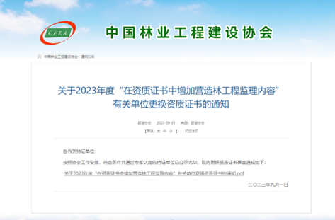 2023年9月1日,中国林业工程建设协会网站发布 “关于2023年度“在资质证书中增加营造林工程监理内容”有关单位更换资质证书的通知”。通知中明确2023年度“在资质证书中增加营造林工程监理内容”认定通过持证单位名单。北京林淼生态环境技术有限公司名列其中,顺利通过认定,取得营造林工程监理资质。