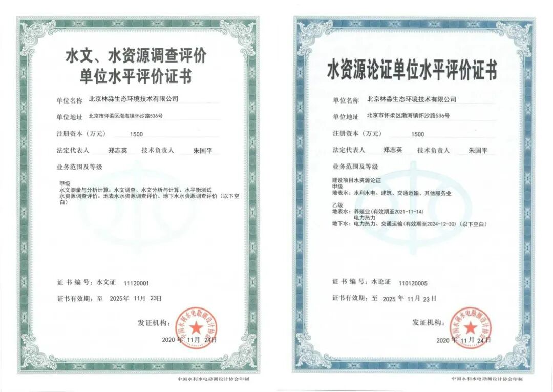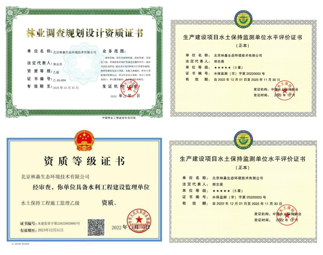 目前公司具有林业调查规划设计乙级资质、营造林工程监理资质、水土保持施工监理乙级资质、环境影响评价甲级、水土保持方案编制水平评价5星、水土保持监测5星、水资源论证甲级、水文水资源调查评价甲级、土地规划设计乙级、环境检测(CMA检测实验室)和环保工程施工专业承包共10项资质。