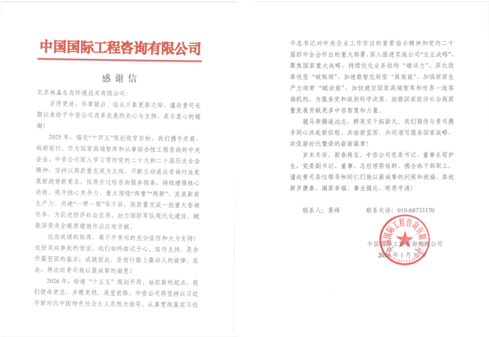 2026年1月30日,我司再次收到来自中国国际工程咨询有限公司(以下简称“中咨公司”)的感谢信!这已是我司连续多年获此殊荣,字里行间的真挚肯定与高度赞誉,不仅是对我司专业能力、服务品质的持续认可,更彰显了双方在生态保护领域长期携手、互信共赢的深厚合作情谊。